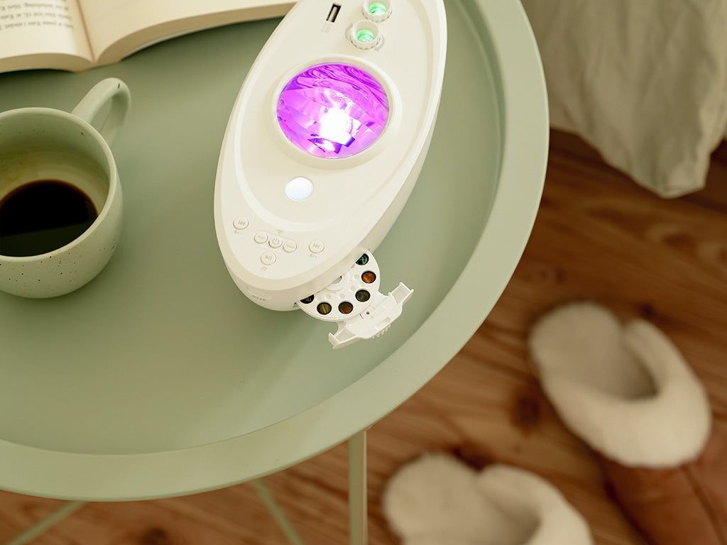 Men det slutar inte med de många visuella möjligheterna. Vi ville att ZENBED™ STARLIGHT GALAXY PROJEKTOR skulle kunna göra ännu mer än att skapa en fascinerande visuell atmosfär. För att göra den till det ultimata verktyget för att förvandla ditt sovrum till en fristad för avkoppling har galaxprojektorn en extra ljudfunktion: med åtta avslappnande och lugnande naturliga ljud kan ZENBED™ STARLIGHT GALAXY PROJEKTOR hjälpa dig att slappna av och till och med somna under stjärnorna.